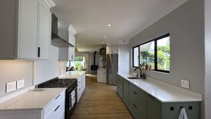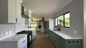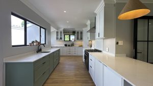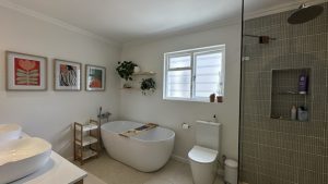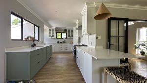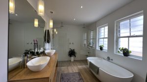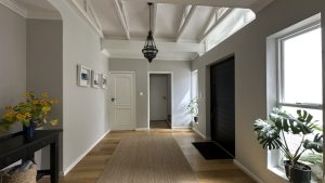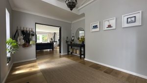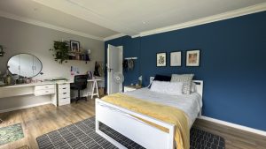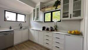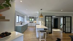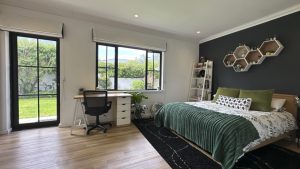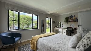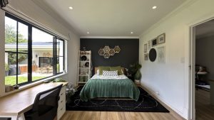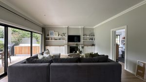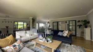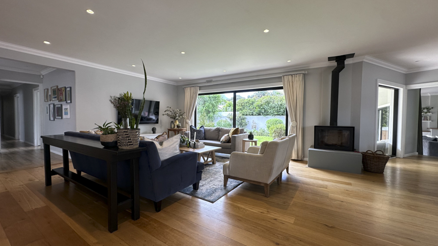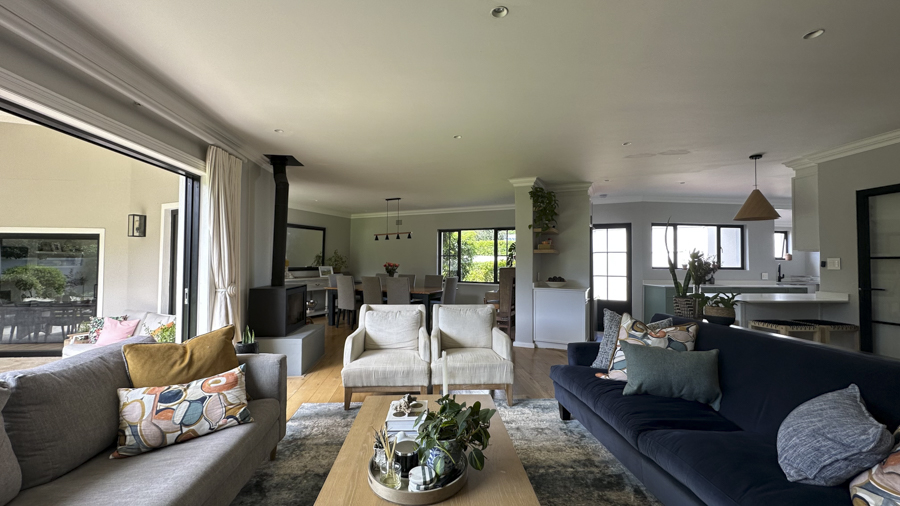 The living areas are warm and inviting, with comfortable modern furniture, natural wood accents, and stylish fittings such as woven pendant lights and a wood-burning fireplace. Open-plan layouts make it easy to capture wide angles or intimate scenes, while the muted colour palette provides a clean and flexible backdrop for set dressing.