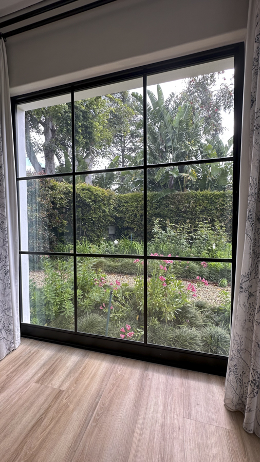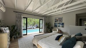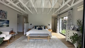 The bedrooms are tranquil and airy, with vaulted ceilings, exposed painted beams, and large windows framing garden views.