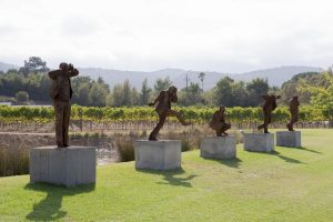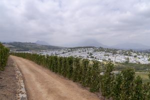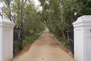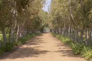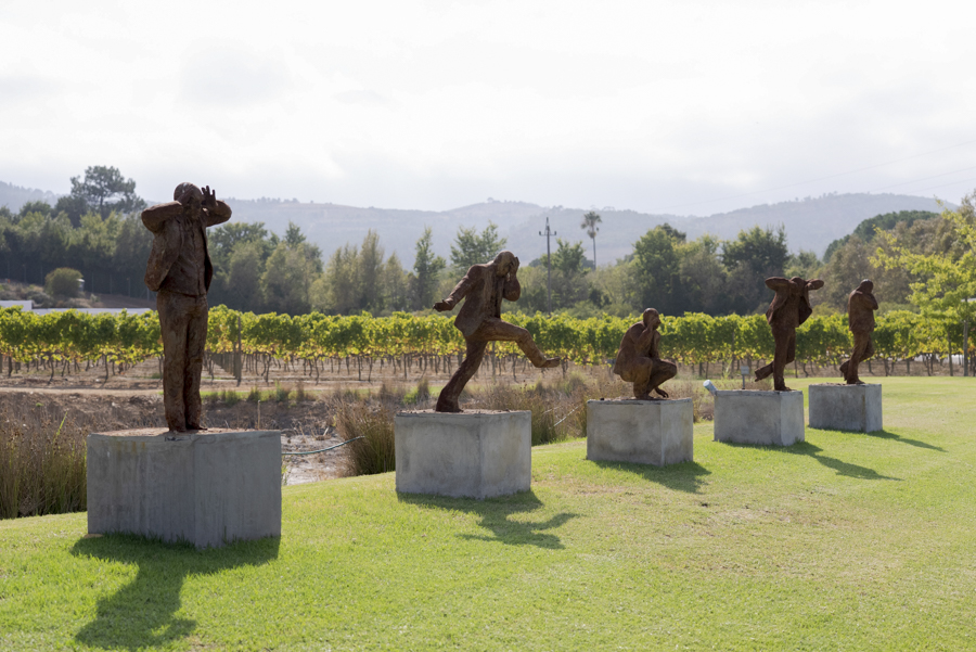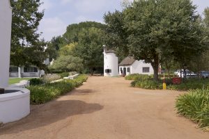 The estate features a grand tree-lined avenue leading towards a striking Cape Dutch manor house, its white gable and symmetrical façade making a timeless and cinematic focal point. Expansive manicured lawns frame the homestead, ideal for wide establishing shots. Beyond, rolling vineyards stretch across the hillsides, complemented by rustic gravel pathways, stone retaining walls, and dramatic mountain backdrops. Sculptural art installations placed throughout the grounds add a modern, creative edge against the natural setting.
